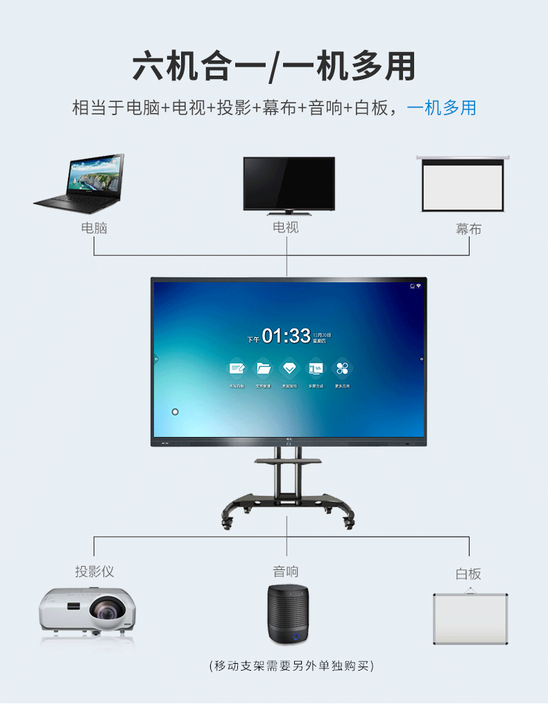 如果會議場地是80平方米以內,參加會議人數在30以內,建議用德天會議一體機具有無線投屏、視頻會議、觸摸書寫、遠程協同、掃碼儲存等功能。尺寸有55寸至110寸,適用不同的會議產地面積,如果您不太清楚采購哪個尺寸的會議一體機,請直接在線客服,或者請直接撥打廠家直銷熱線張經理:134 1883 3152(微信號:13418833152)