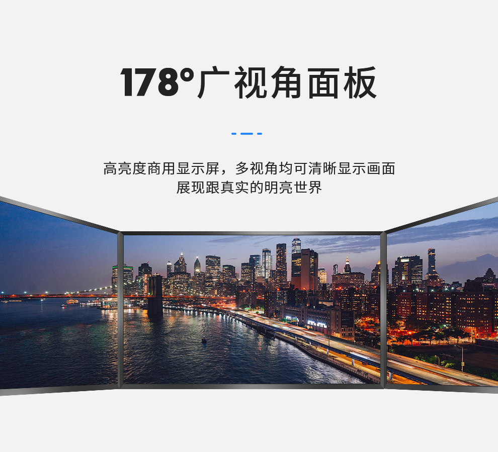 采用進口LG模組工業屏,4k高清畫面,7*24小時不間斷運作,178度廣視角,高速處理器主板,防塵防潮等特點。