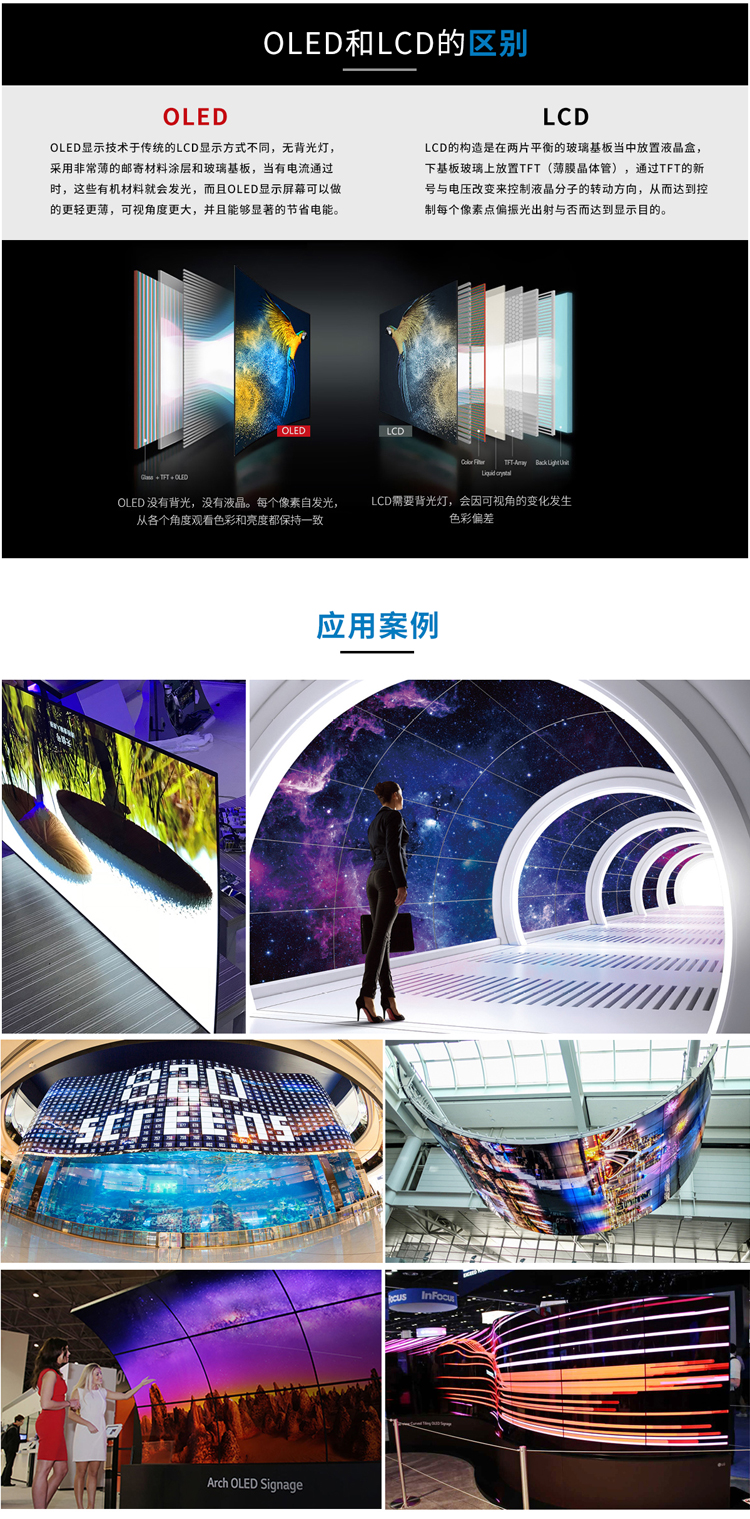 開放型曲面OLED顯示屏說明:運用OLED顯示屏,纖薄輕巧的屏體,無需額外安裝支架,卓越的畫質高度還原顯示屏色彩,完美推送品牌推廣圖片,文字,視頻的同時,體驗炫酷的視覺效果。
