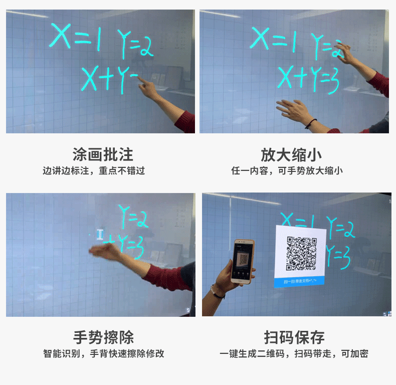 十點觸控,非常穩定,會議白板,無線投屏,遠程協作,主板采用安卓工控主板和X86工控主板,安裝win7或者win10 系統。