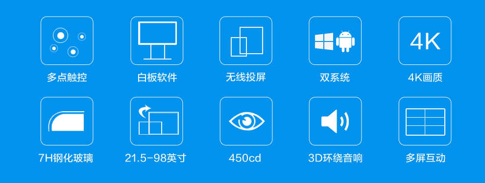 十點觸控,非常穩定,會議白板,無線投屏,遠程協作,主板采用安卓工控主板和X86工控主板,安裝win7或者win10 系統。